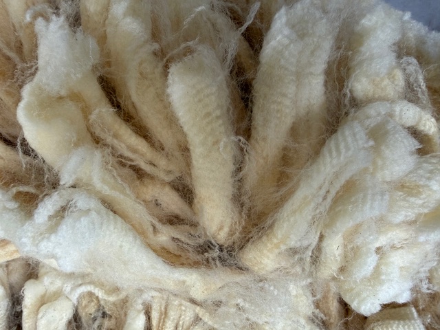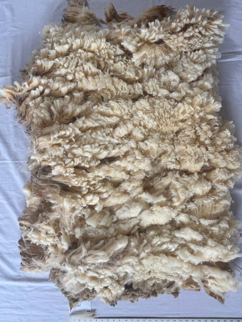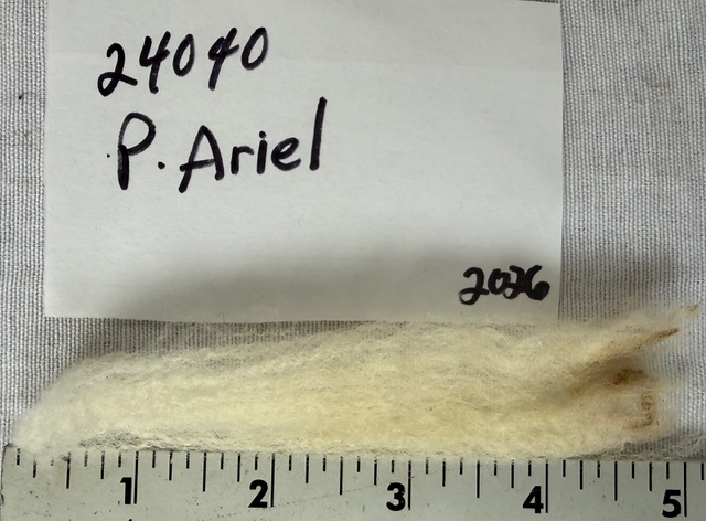 Princess Ariel is 75% Cormo and 25% Corriedale. Her 2026 fleece is fine and super soft. It was protected with a coat, has been well-skirted, and is very clean. It has a 5″ staple length. Skirted weight of the full fleece is 7.4 pounds. I am offering it as a whole fleece only. Price $24/lb. Cost for the whole fleece: $177.60 + tax, with $30 shipping. I will ship as economically as possible and refund you any difference in shipping cost .