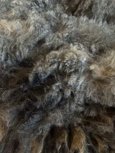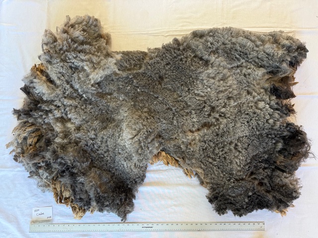 Cinder is a black Corriedale ewe whose fleece has gone beautifully grey, with shades in the charcoal to medium-grey range. Her fleece was protected with a coat, has been heavily skirted and is very clean. It has a staple length of 5 inches. Skirted weight of the full fleece is 6.3 pounds, and I am selling it as a whole fleece only. Price $22/lb. Cost for the fleece: $138.60 + tax, with $30 shipping. I will ship as economically as possible, and refund you the difference in shipping charge.