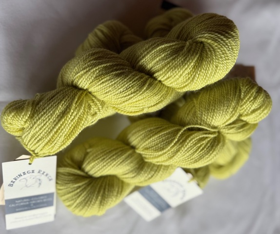 DK-weight Romney yarn from the fleeces from our Romney ewe Pearl and her boyfriend Chuck, hand-dyed with Black-knight Scabiosa flowers grown on our ranch. Color is a light lime-green. 2-ply, 284 yards per 4 oz skein. Gauge: 5.5 stitches/inch on size 5 to 7 needles.