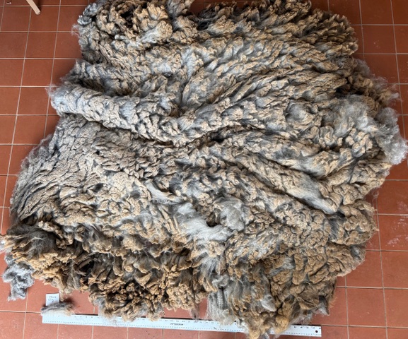 A raw grey Romney x East Friesian fleece for handspinners, sold as two half-fleeces.