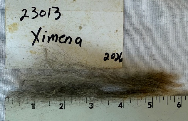 Ximena is a recessive-colored Romney ewe. Her fleece ranges in shade from medium to dark grey, with a lovely crimp and luster. It was protected with a coat, has been well-skirted and is very clean. It has a staple length of 6 inches. Skirted weight of the full fleece is 6.3 pounds, and I am selling it as a full fleece only. Price $18/lb. Cost for the whole fleece: $113.40 + tax, with $30 shipping. I will ship as economically as possible and refund you the difference in shipping cost .